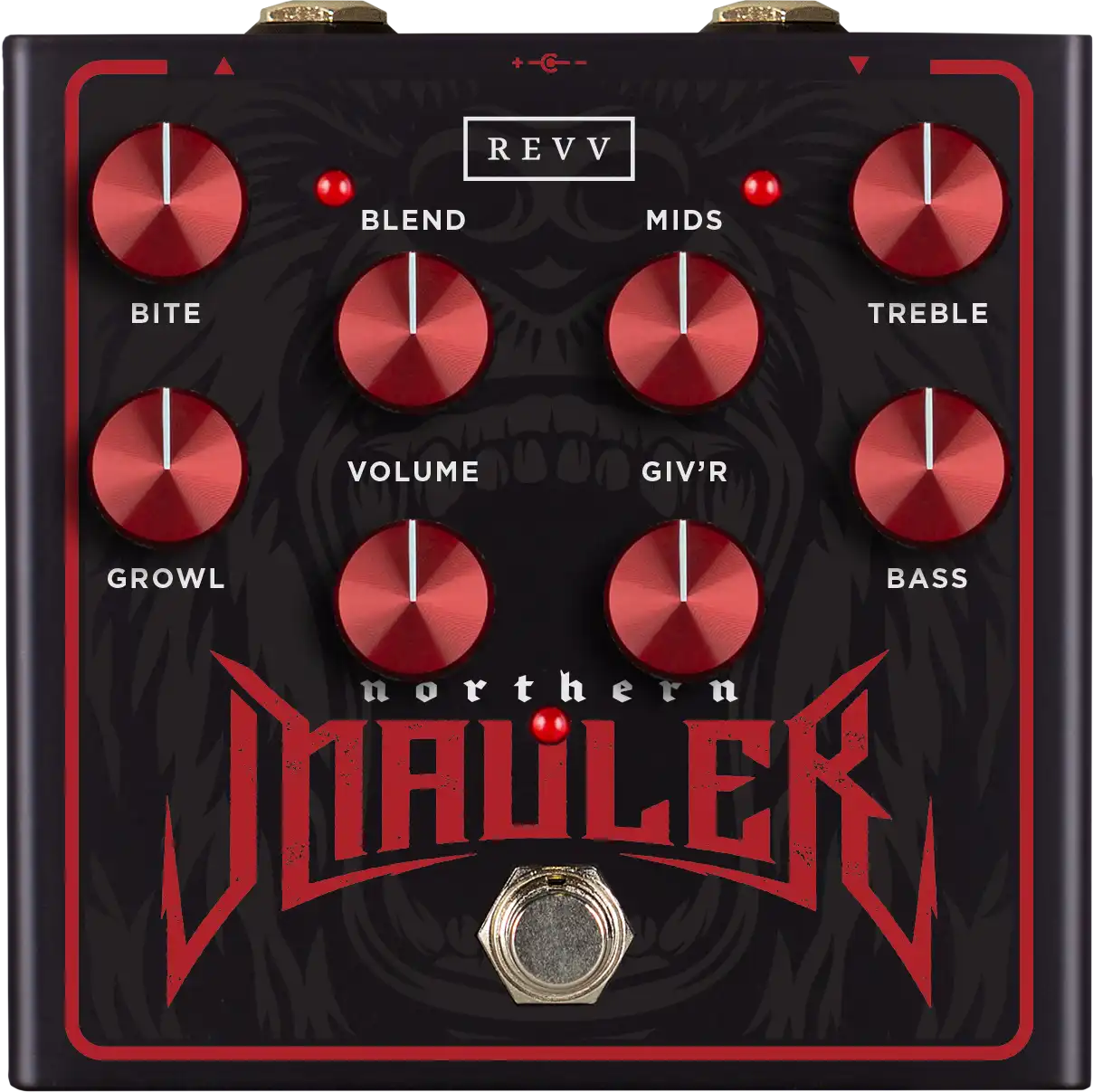 The Northern Mauler contains two circuits that are combined with the Blend knob: Chainsaw & Amp. The Blend knob at noon provides an equal mix of both tones. Volume & Giv'r (that's Canadian for "Gain") are global, while the circuits have independent controls on the left & right. You can use the Chainsaw circuit to boost a high gain amp by setting Blend 100% to the left.